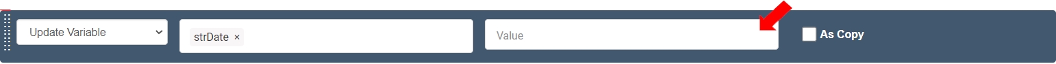 To further refine the desired value it is possible to call the Variable functions from the returned value of the function DateTime.currentdate(yyyy-mm-dd). Since the value returned is of type string, further drilling into the returned value will present the Variable functions of the string. To drill into the Variable functions, click on the text of the function name. It displays the Variable functions.