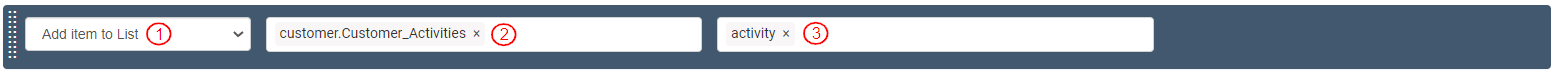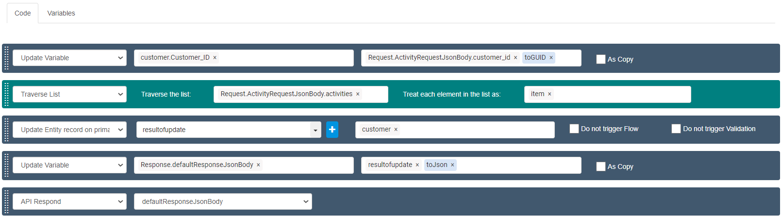 * To traverse a list of items received in the Activities list in the Request, update each item to the corresponding field in the record for the Activities entity and update the information for the customer via the “Customer\_Activities” relation, define the second Action as follows: