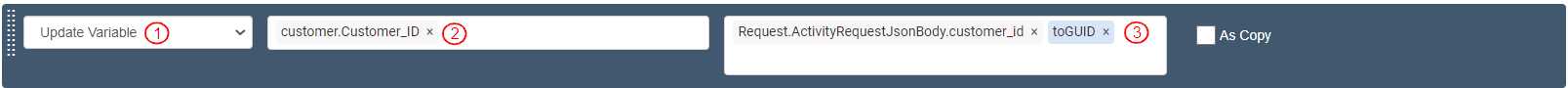 3. Select Value as Variables>Request>ActivityRequestJsonBody>customer\_id>toGUID(). It displays as “Request.ActivityRequestJsonBody.customer\_id.toGUID()”.