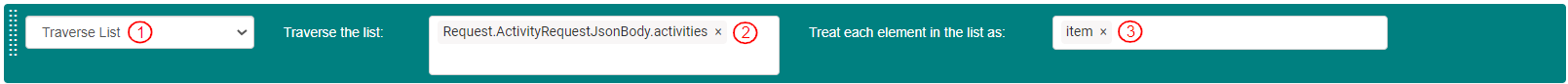 2. Select “Traverse the List” as Variables>Request>ActivityRequestJsonBody>Activities. It is displayed as “Request.ActivityRequestJsonBody.Activities”.