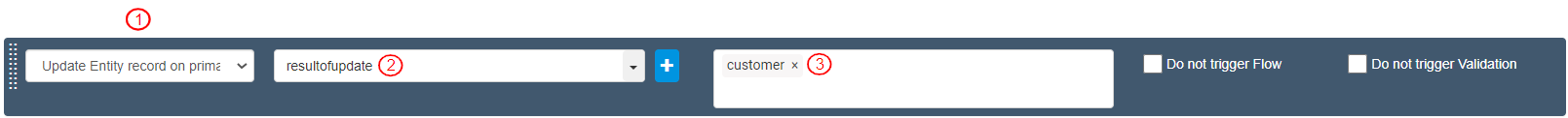 1. Select Action as “Update Entity record on primary key”. This Action updates the record of the Target Entity or related entities based on the primary key.