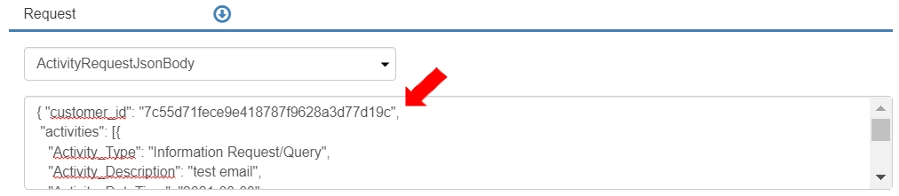 In the “Request” section, update the Json object in the Request section with values to test. In this case, we add two (2) activities for the customer with a certain customer_id (Users must ensure to add a customer_id present in the entity “UserName_Acc_customers,” else it will give an error message). Copy the following code and paste it into the Request section on the Test Console. (Ensure the data is present in the target entity)