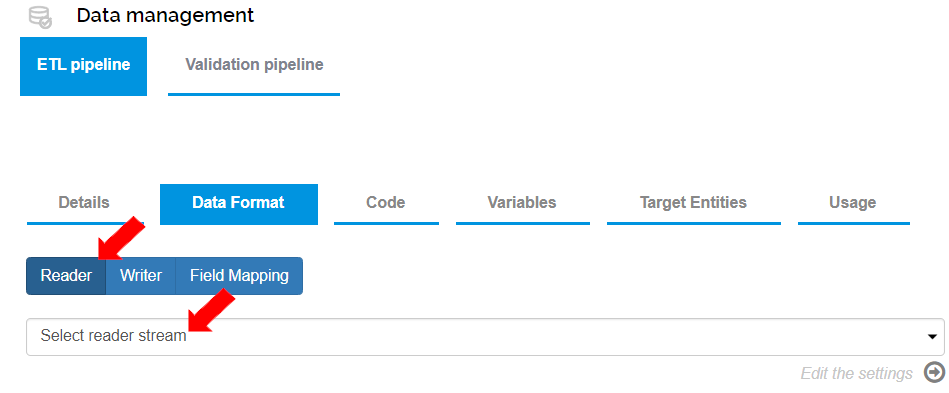 Records can be read from Langstack Entities or external data sources (using Connectors) through the settings defined in the ETL pipeline>Data Format>Reader tab.