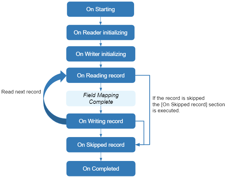 If skipping the record is set to True in the “On Writing record” when the record is read, the functon execution sequence is as follows: