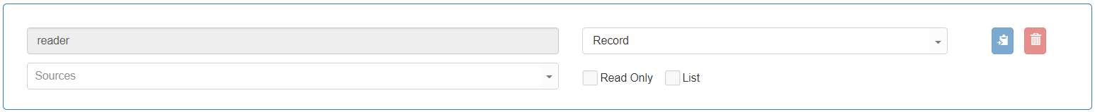 “reader” of the data type “Record”: This variable contains the details of the record as defined with the fields present in the Data Format tab>Reader>Source fields.
