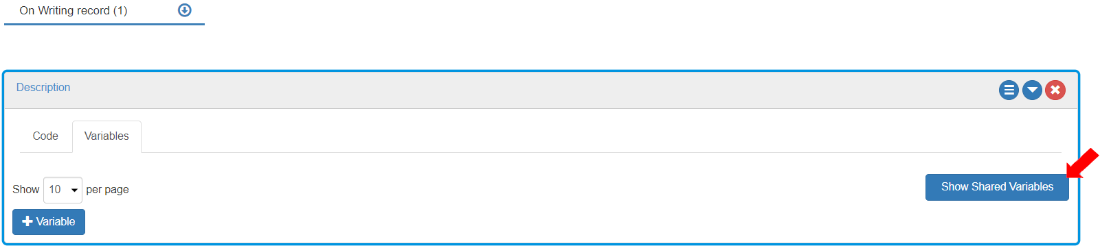 In the scope of “On Writing record” function three variables are visible and therefore are available to all Action boxes within this section. These are displayed by clicking [Show Shared Variables] in On Writing record>Action box>Variables.