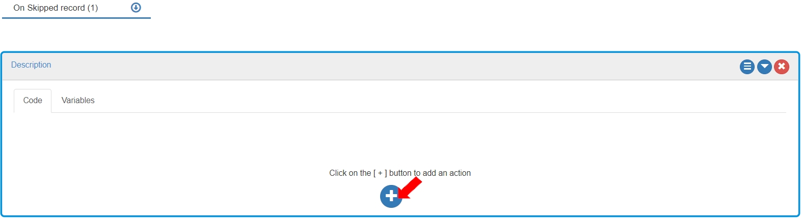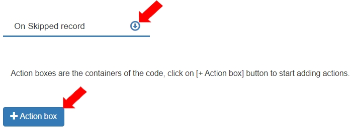 To define the actions to be executed for the records that are skipped, go to the “Code” tab>“On Skipped record” section. To add an “Action box” in the “On Skipped record” section, click the [+ Action box] button.