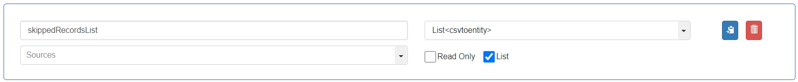 In the “Variables” tab, add and define a variable as follows: Name: “skippedRecordsList”, Data type: “csvtoentity”, Select “List”.