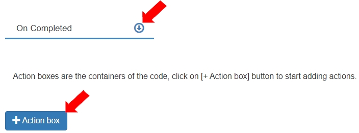 To define the Actions to be executed once the ETL pipeline run is completed, go to the Code tab>On Completed function. To define the actions, add an “Action box” by clicking the [+ Action box] button.