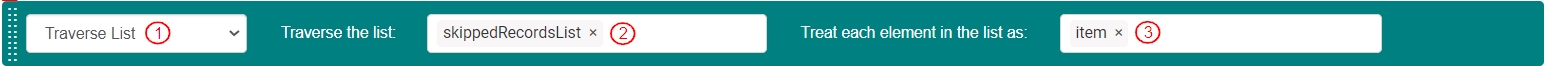 To create the entity record for the skipped records detail from the traversed item, add and define an action in the Traverse List action as follows: