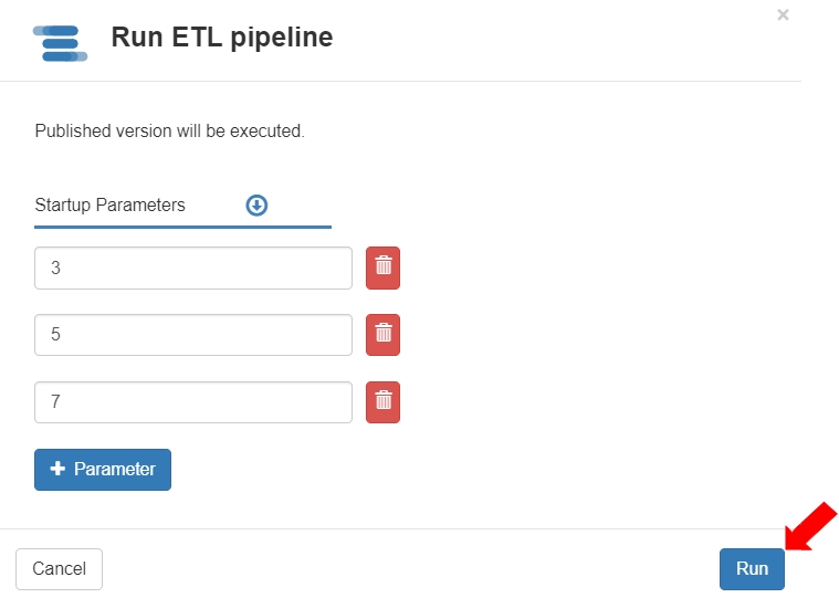 The Run ETL pipeline dialog box displays. To add a parameter (to add value for StartupParameters) click the [+ Parameter] button. Add three (3) parameters.