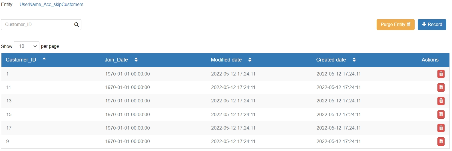 For a list of Customer IDs ranging between 1 and 17 (odd numbers), the records with Customer_D “3”, “5”, and “7” are skipped in the target destination.