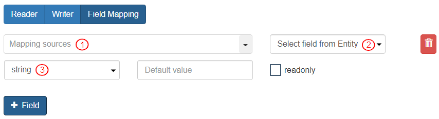 To map the reader source fields to the entity destination fields, select the “Field Mapping” tab. To add the Mapped Fields, click the [+ Field] button and add relevant information.