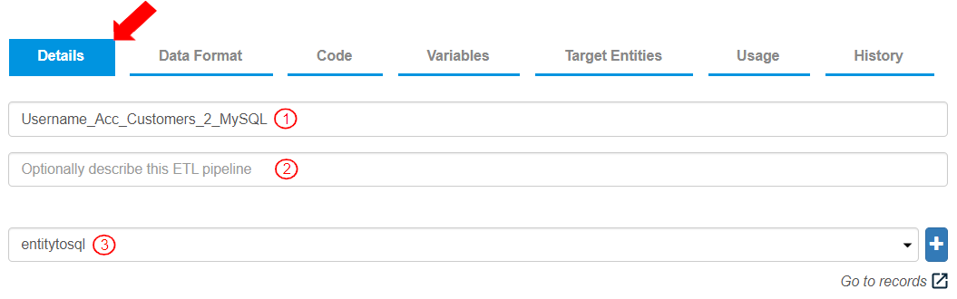 Enter a name for the execution log for this ETL pipeline as “entitytosql”. This log will be updated each time the ETL pipeline is executed and can be viewed by clicking “Go to records”.