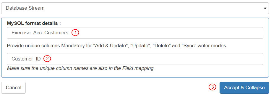 Add Table name as “Exercise_Acc_Customers”. This is the name of the table that the ETL pipeline will write the data. This name must be exactly the same as the name for the destination table name.