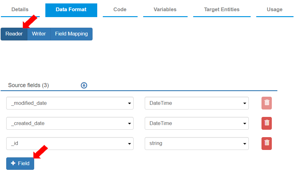To align the source fields with destination fields, click on the “Data Format” tab. In this tab, the settings for the reader and writer format are defined (based on the settings for the data source and the data destination). The “Reader” tab is selected by default. To add source fields, click the [+Field] button. Add all required fields.