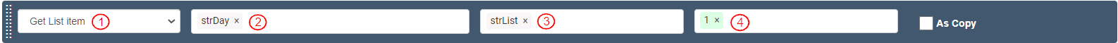 To store the second item of list of strings (day's value) in the variable “strDay”, add and define an action after the “Condition action” as follows: