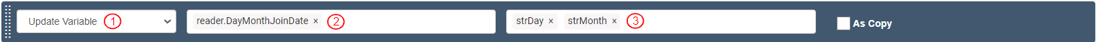 To update the values of the Day and Month in the reader field of “DayMonthJoinDate”, add and define an Action as follows: