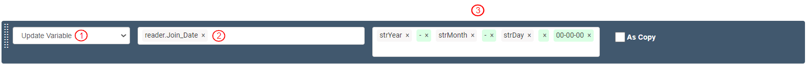 To update the values of day, month and year in the Join_Date read by the Reader into the format of the Join_Date field in the entity (yyyy-mm-dd hh:mm:ss), add and define an Action as follows: