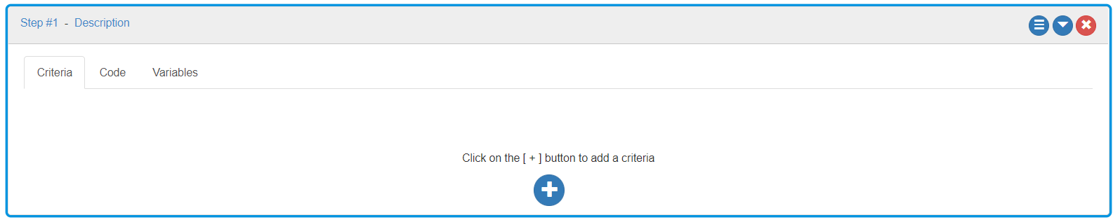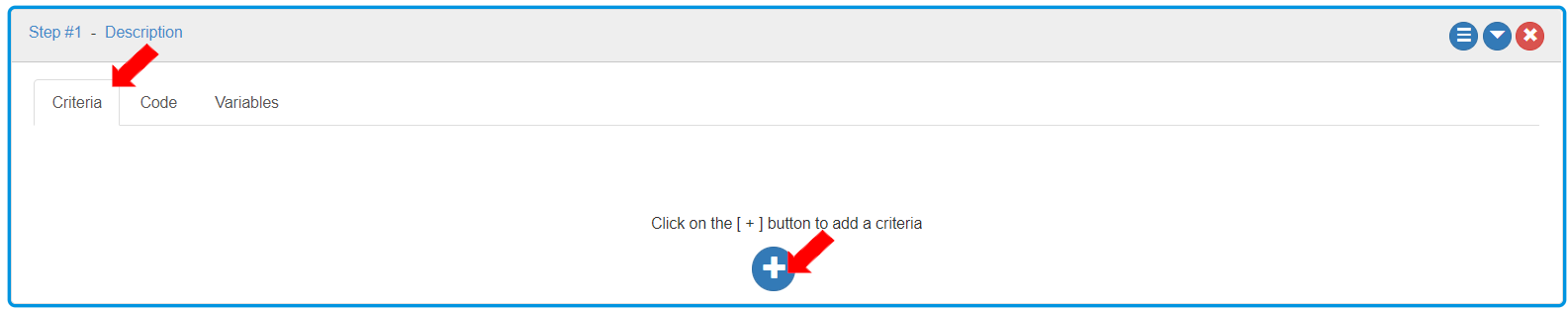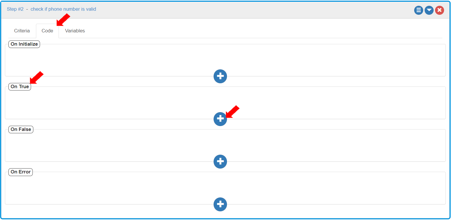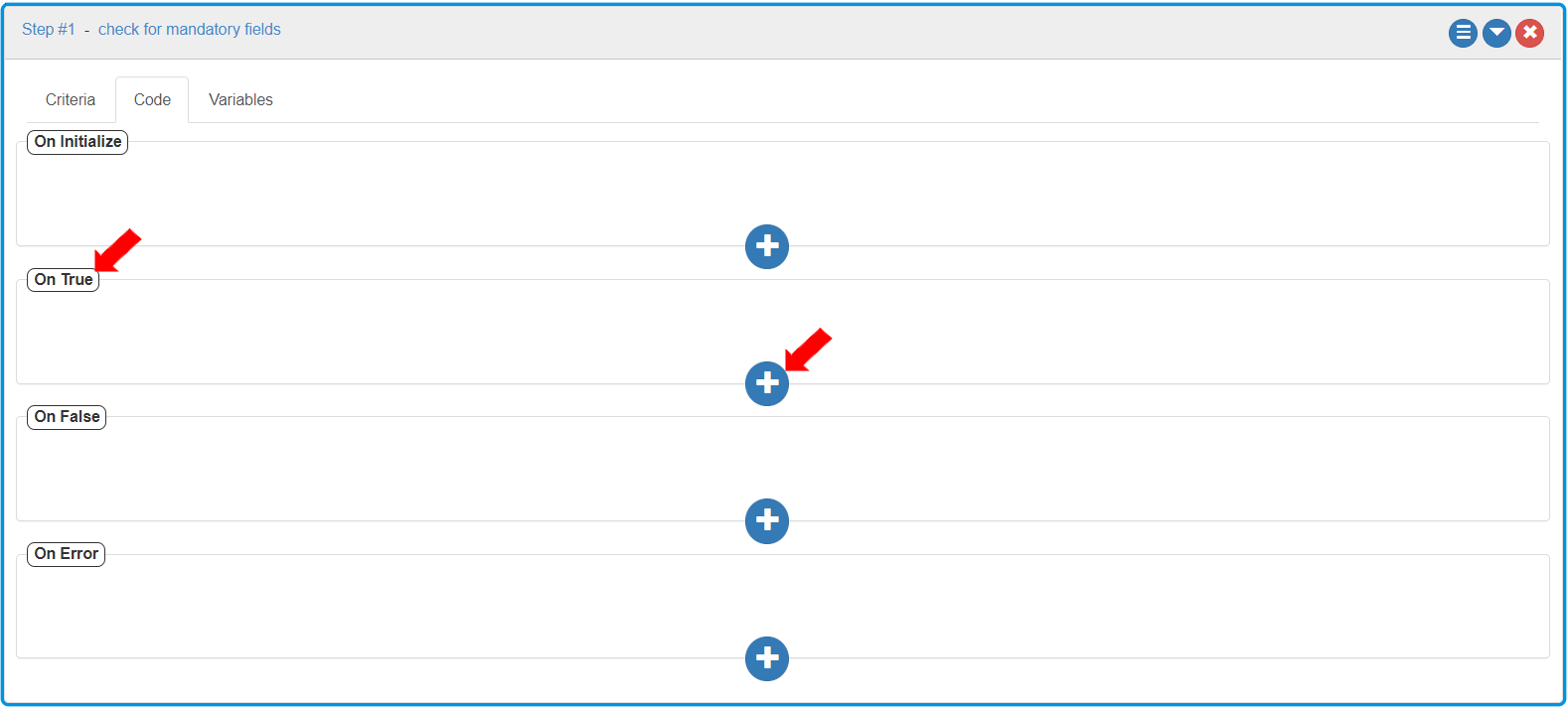 To define the actions if the Criteria returns true, go to the Code tab>On True section of βStep 2β to define the sequence of actions. Add an Action by clicking the (+) button.