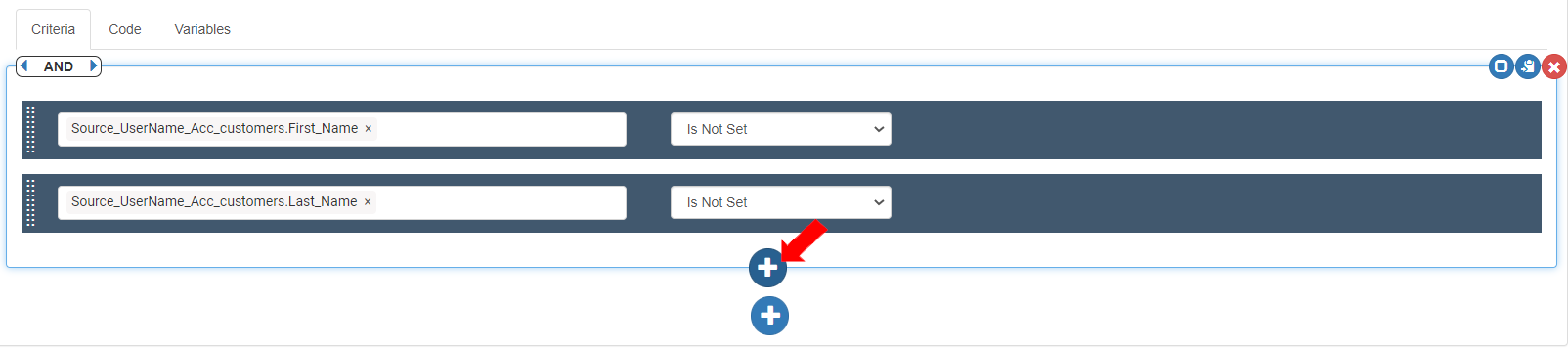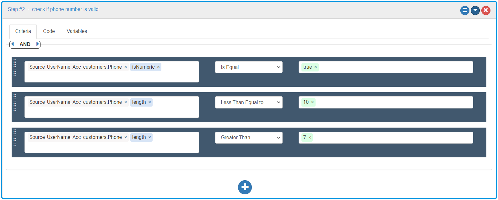 To verify the phone number data type, minimum length and maximum length, add three (3) Criteria bars by clicking the (+) button in the βCriteriaβ tab.