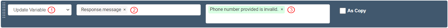 To define the response details in case invalid customer phone data is encountered, go to the Code tab>On False section. Add three (3) Actions by clicking the (+) button.
