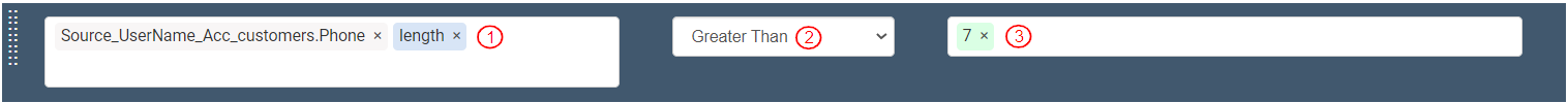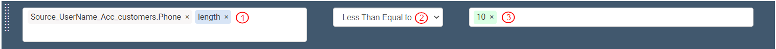 Select Source as Source_UserName_Acc_customers>Phone>length(). It is displayed as βSource_UserName_Acc_customers.Phone.length()β. This measures the length of the strings entered into the field.