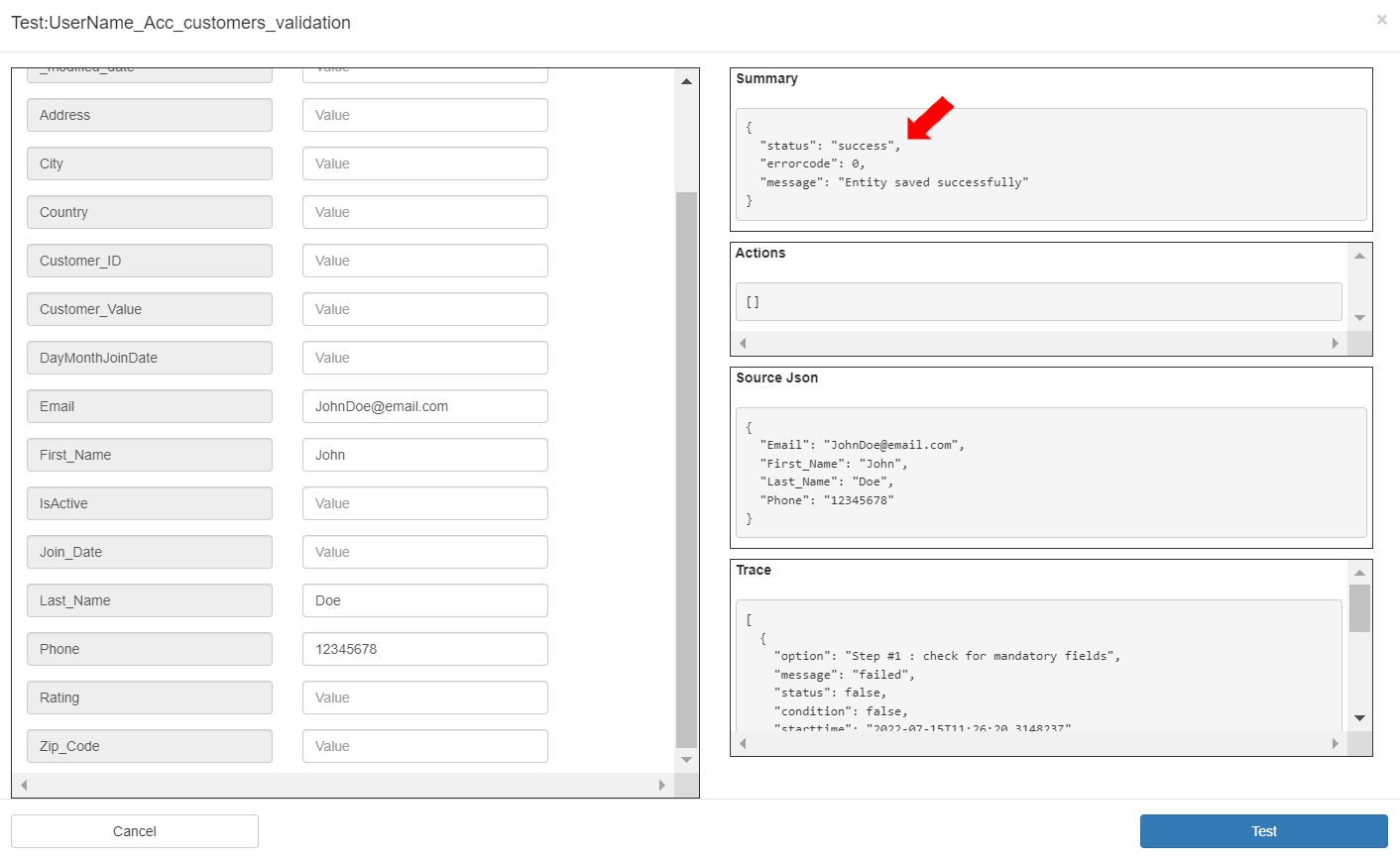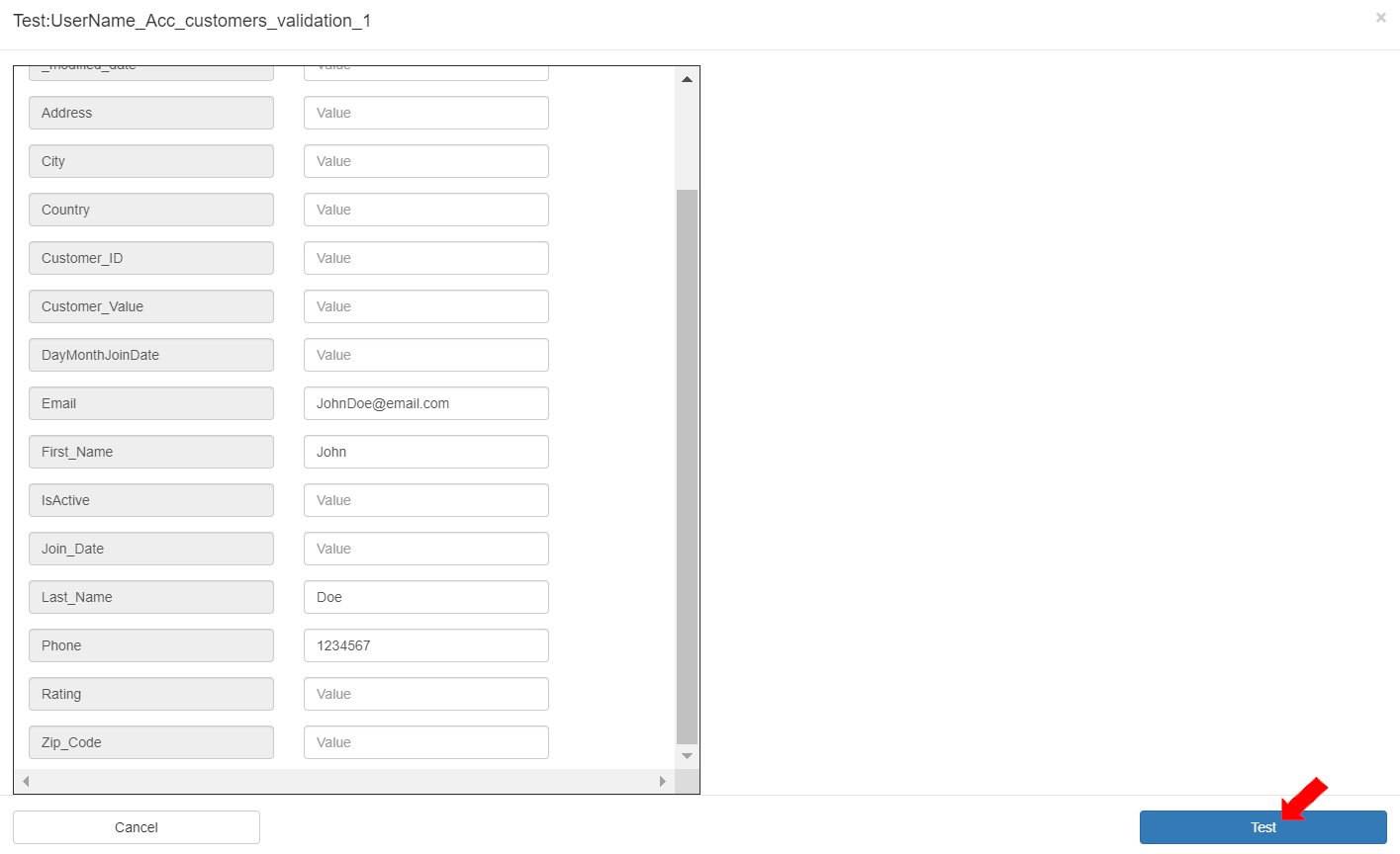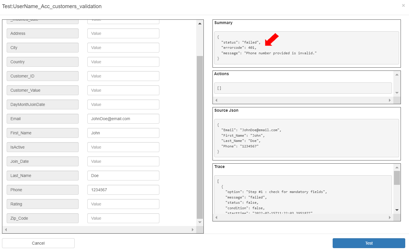 To test the validation, in the Validation pipeline “UserName_Acc_customers_validation”, click the [Test] button.