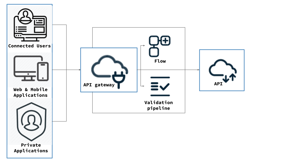 The data with the associated Validation pipeline and Flow are passed to the API from the API gateway.