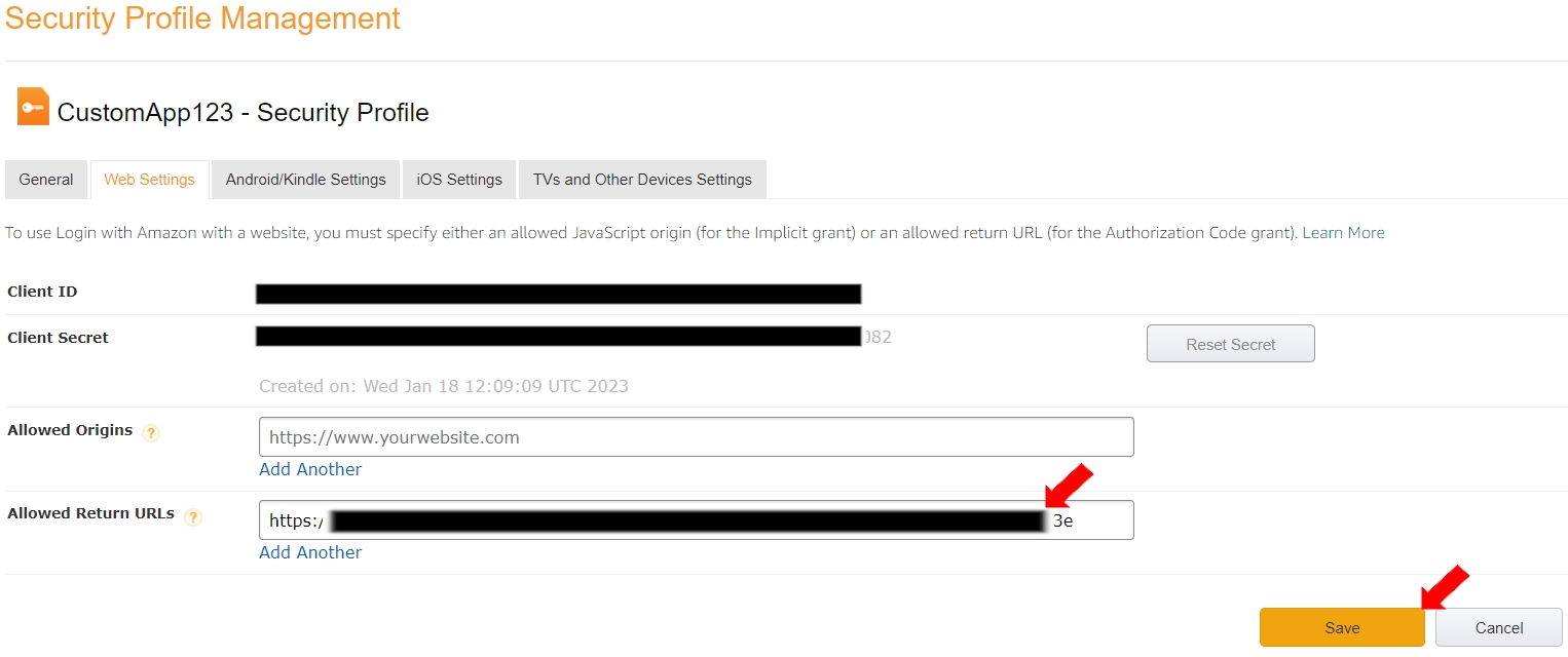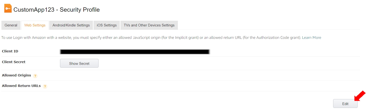 Go to Amazon Developer Console > Security Profile Management for the app. Click on [Web Settings].