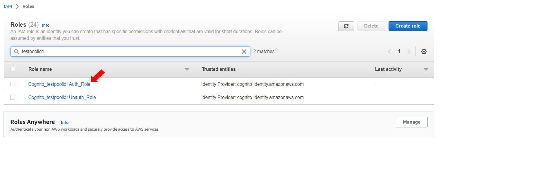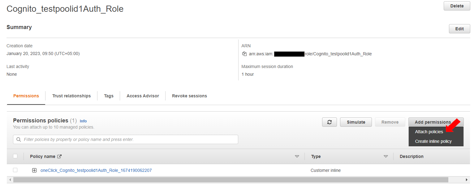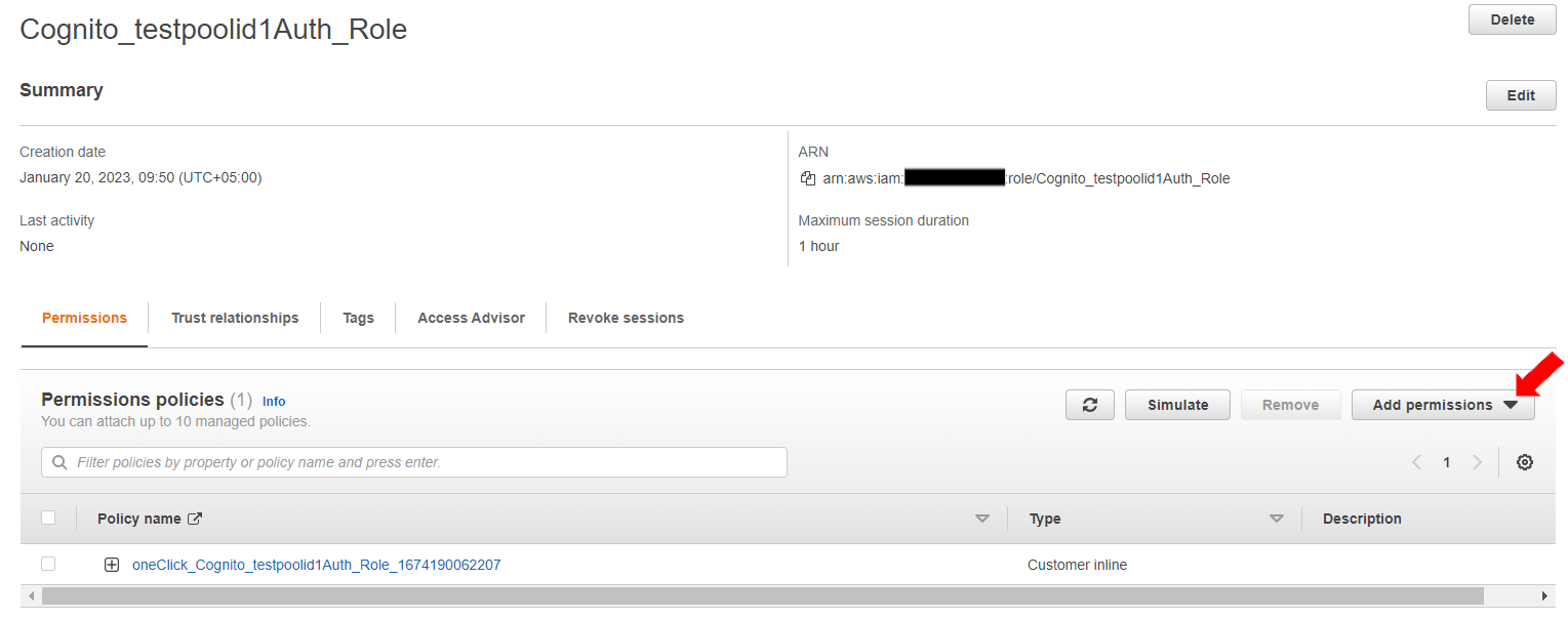 Click on the role name to set permissions for it. For this exercise, first click on “Cognito_testpoolid1Auth_Role”.