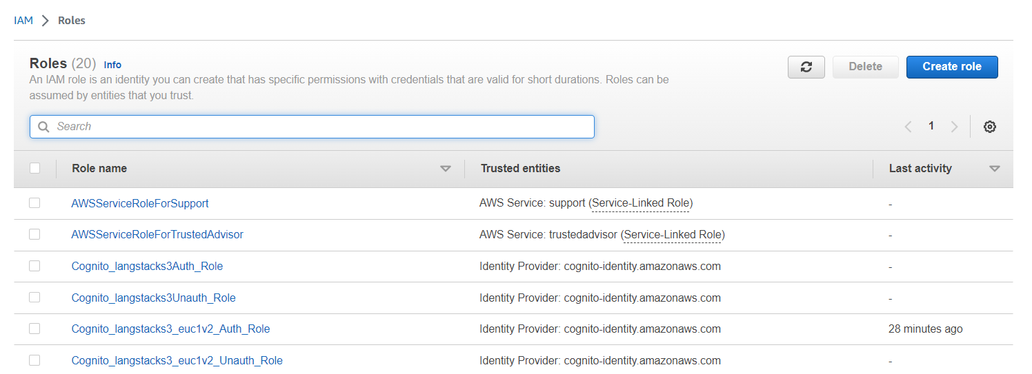 A list of roles displays for the identity pool.