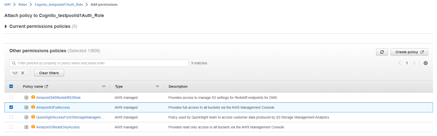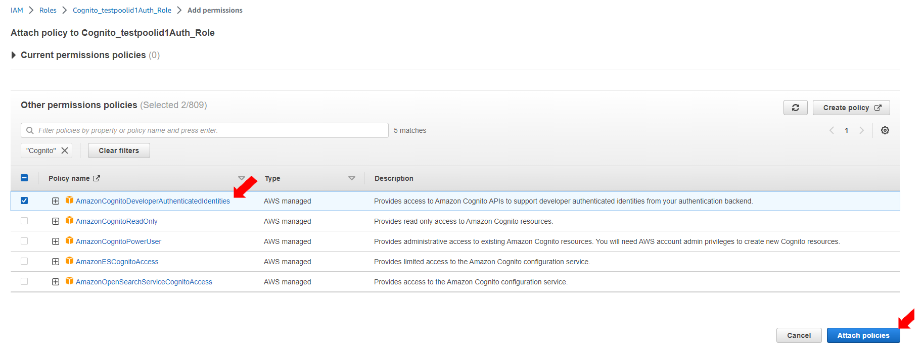 Search for Cognito and select and click [Attach policies].
