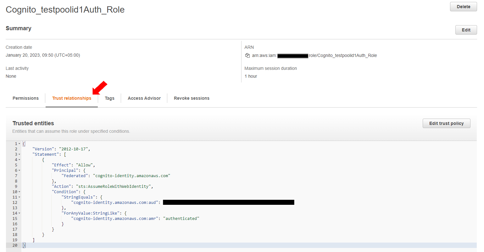 The summary page for the role displays. Click on the “Trust relationships” tab. Ensure correct Identity Pool id.