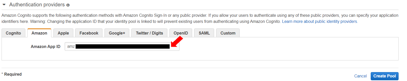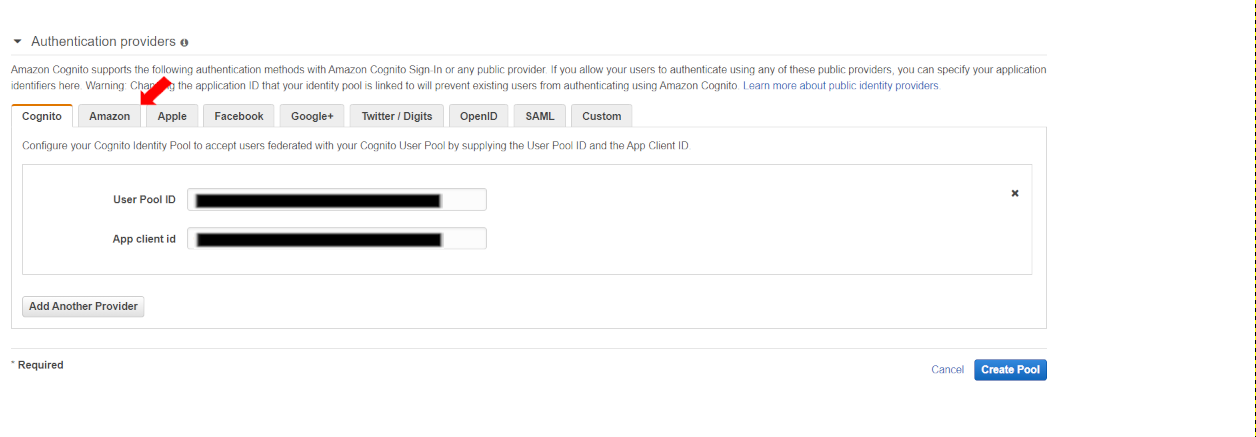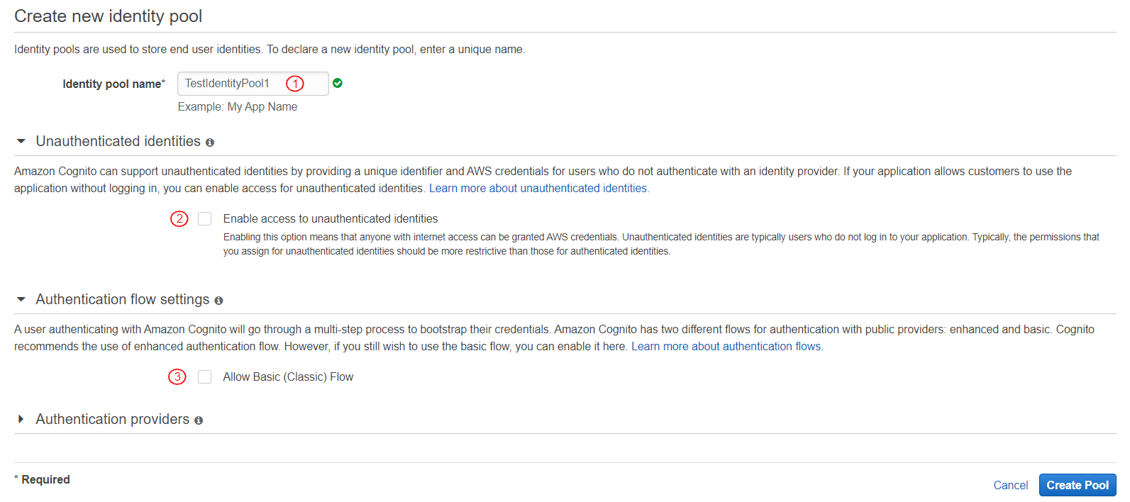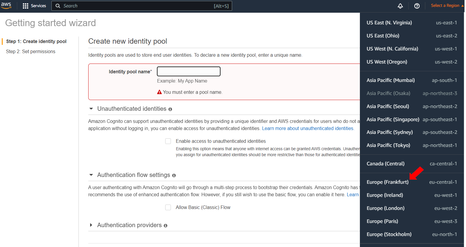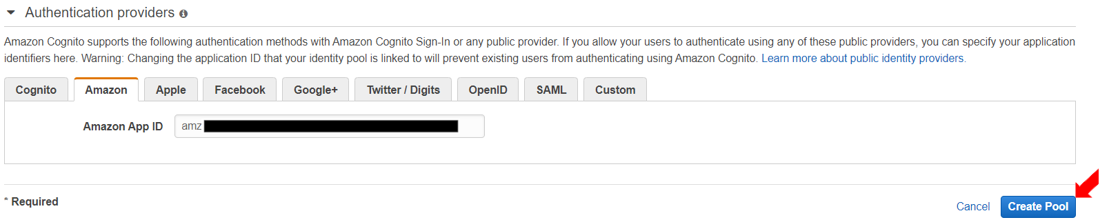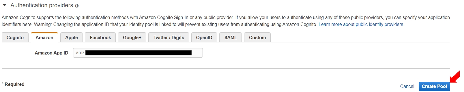 The Identity Pool must be created in the AWS console by a root user or a user that has been granted permissions by the root user. To get the Identity Pool Id, follow the steps below: