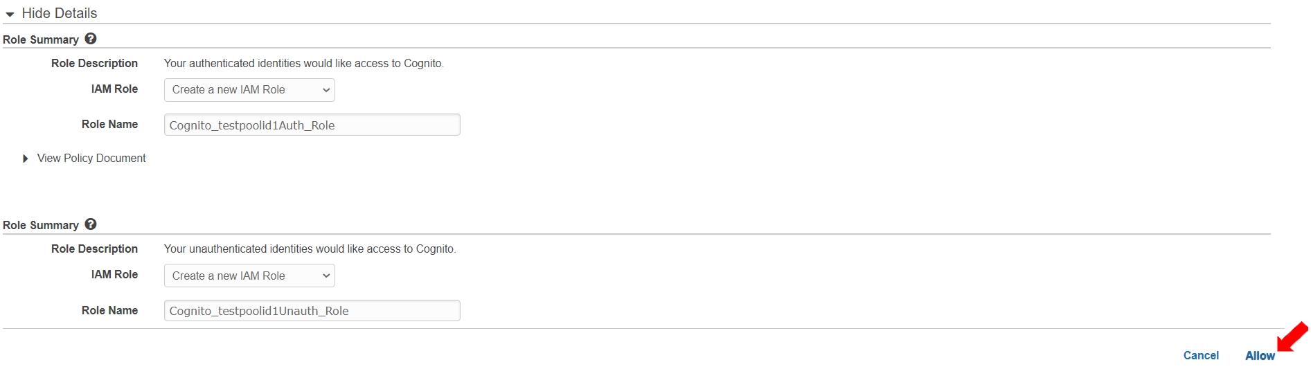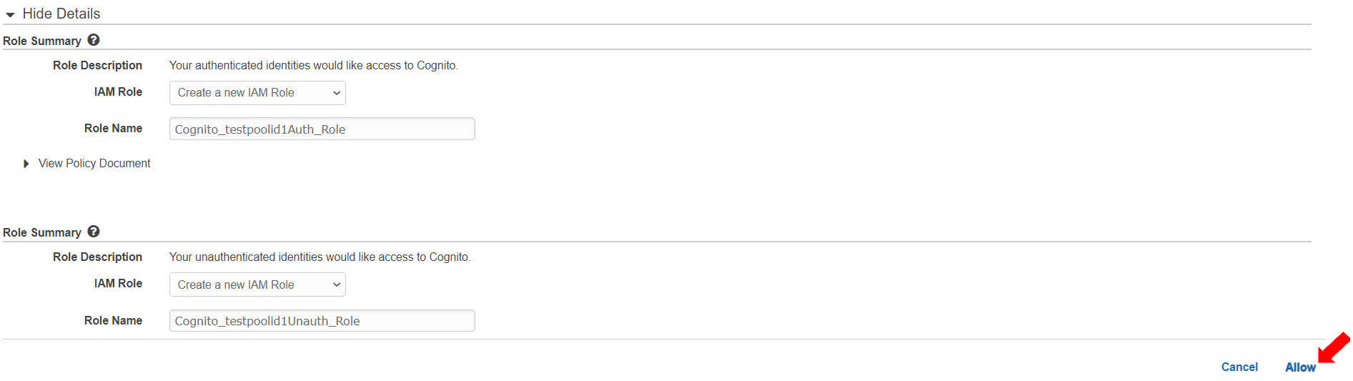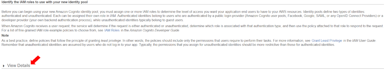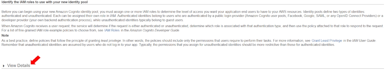 The page displays for identifying IAM roles associated with the identity pool. Click on “View Details” to expand the section.