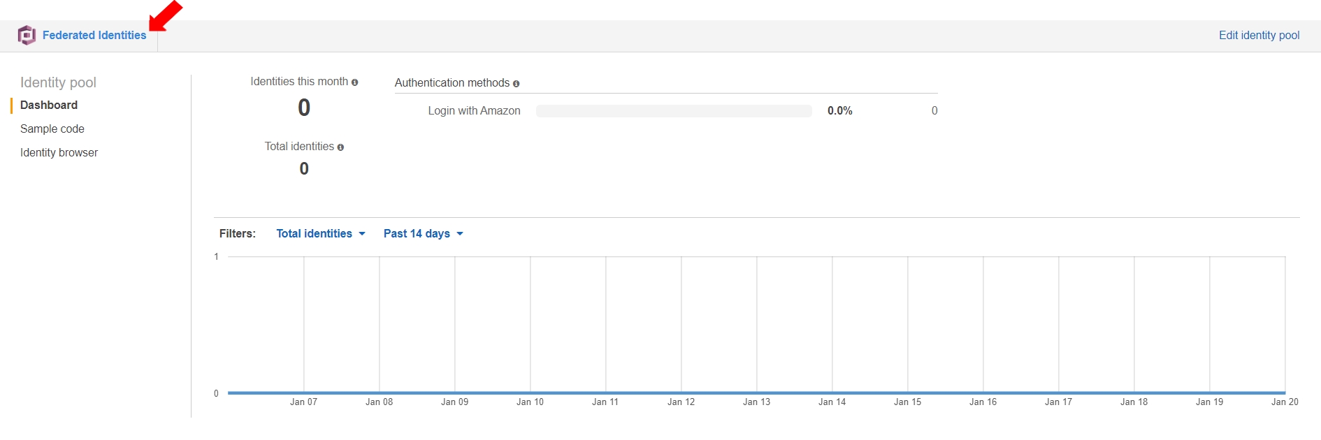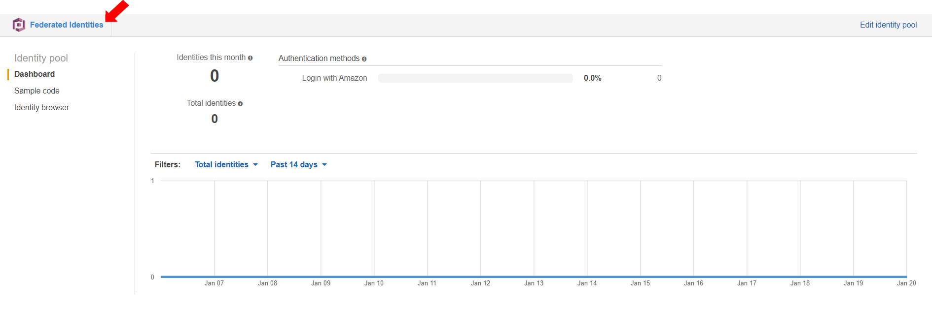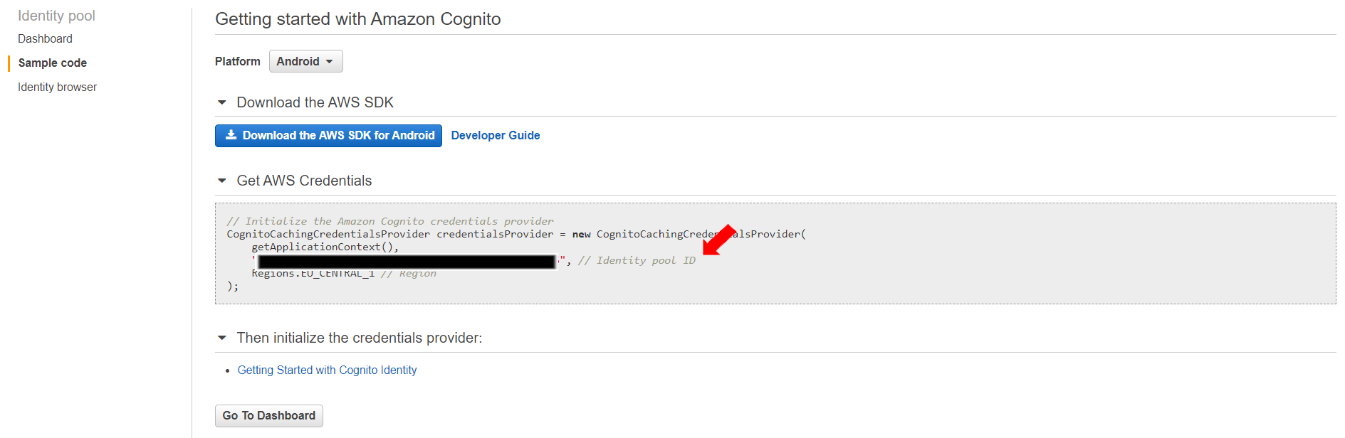 The “Sample code” page displays. Select the Identity pool ID from the code and secure it for later use. (highlighted red and in quotes).