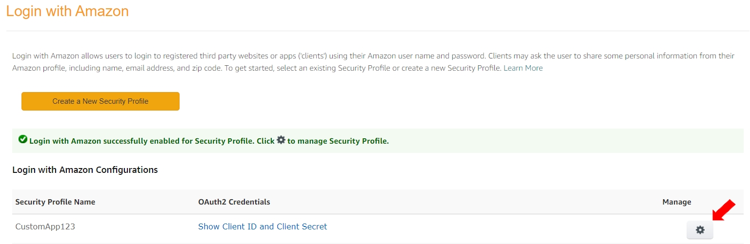 At “Login with Amazon” console, click [Create a new Security Profile] to create a security profile.