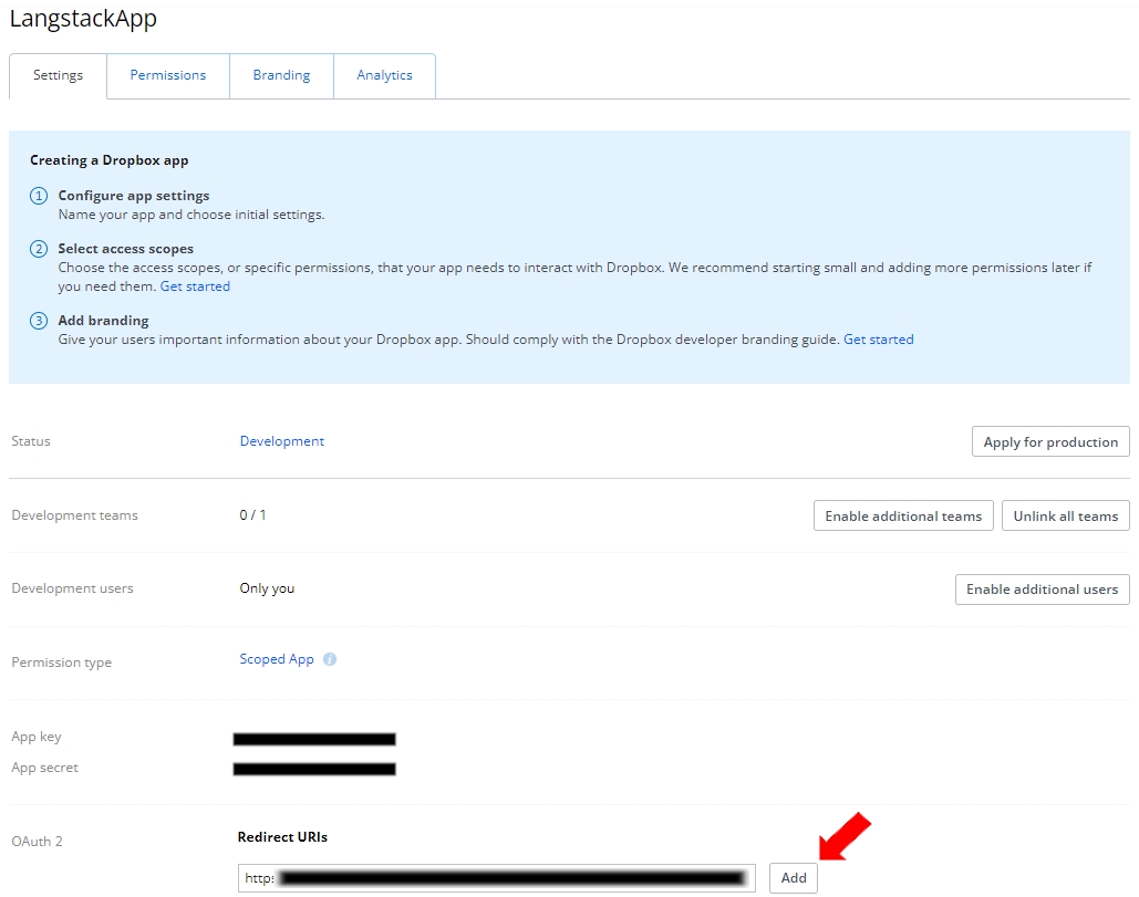 Go to the Dropbox app> Settings tab. In the “Redirect URIs”, paste the URL copied from the Dropbox connector and click [Add].