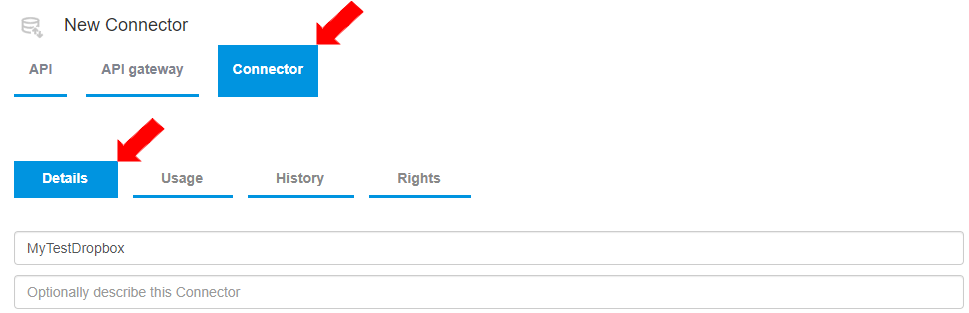 In the Connector settings, the OAuth 2.0 Credential Type settings are displayed. Enter the information (Credentials) generated in DropBox Account Setup.
