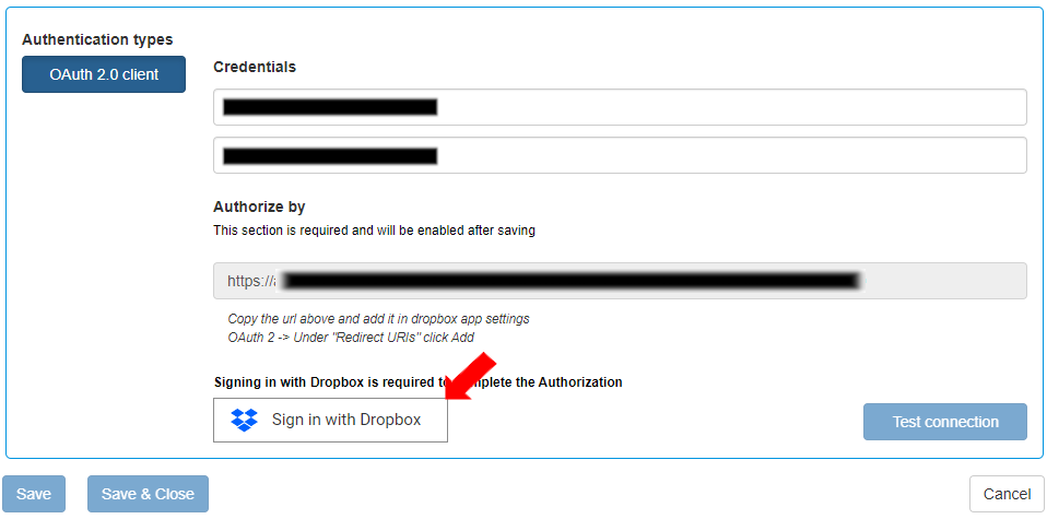 For authorization through Redirect URL, follow the instructions below the url: βCopy the url above and add in Dropbox app settings OAuth 2 under βRedirect URIsβ and click add.