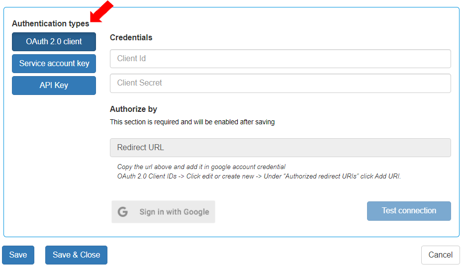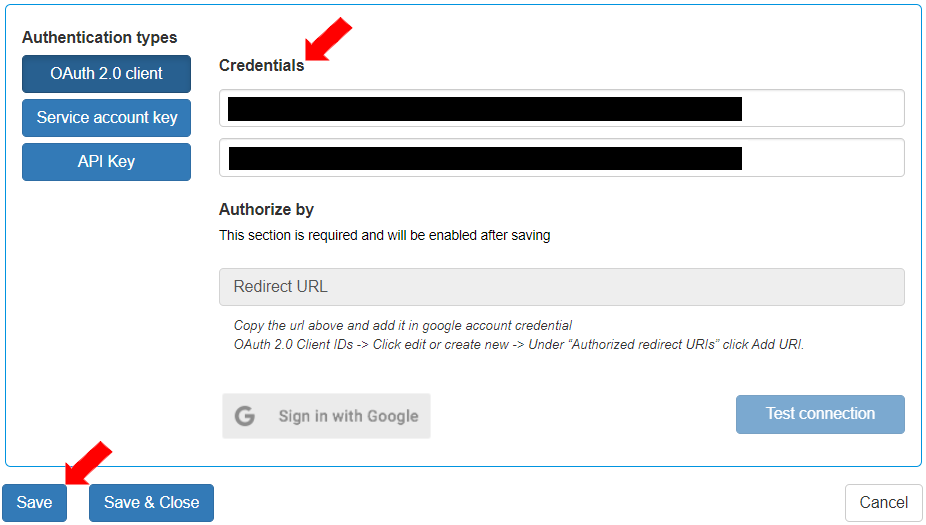 Enter the credentials Client ID and Client Secret generated in Google Account setup>OAuth 2.0 Client credentials and click [Save].