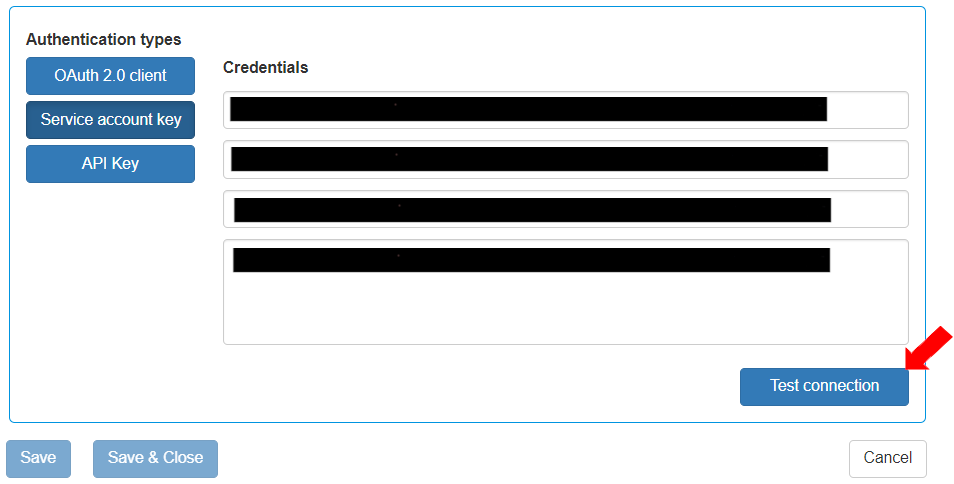 Enter the following credentials from the Json file downloaded from GCP during Google Account setup>Service Account Key credentials and click [Save]: