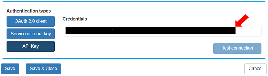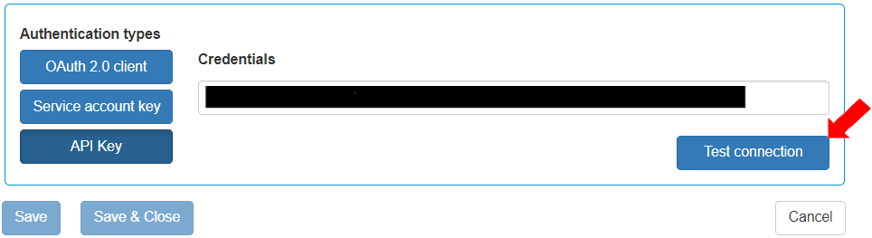 * The \[Test Connection] button becomes activated and the API Key gets encrypted.