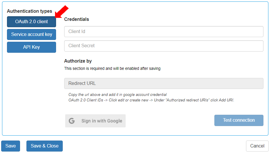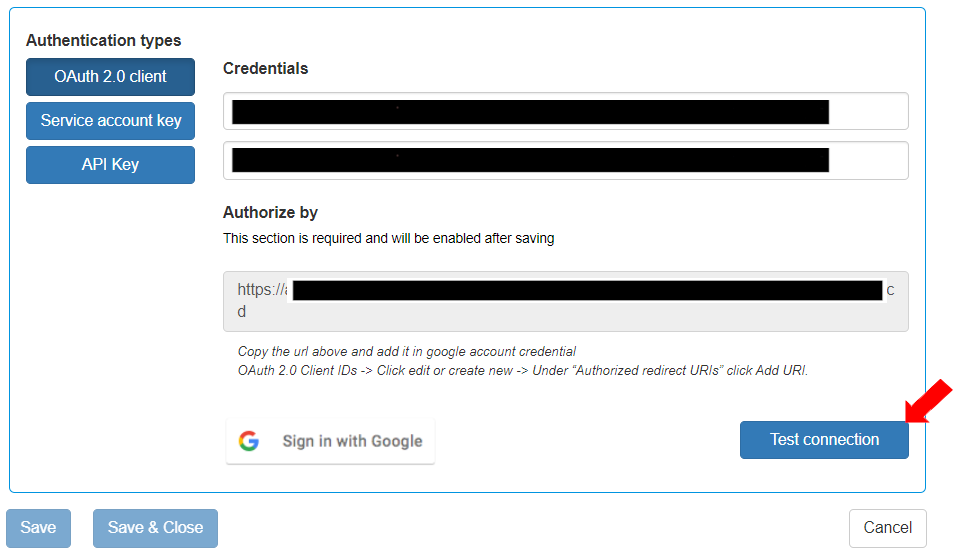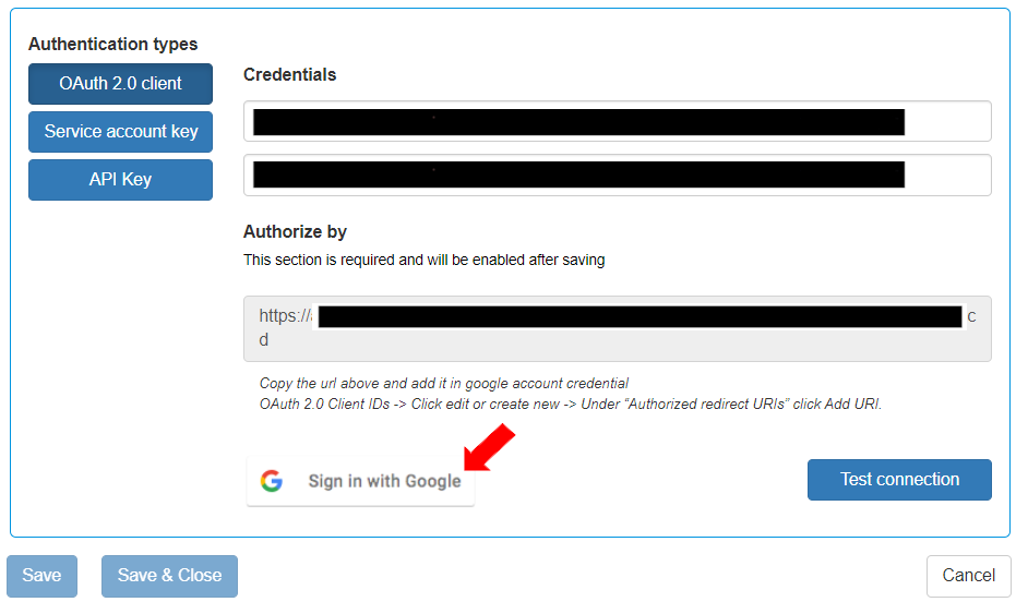 * Enter the credentials Client ID and Client Secret generated in Google Account setup>OAuth 2.0 Client credentials and click \[Save].