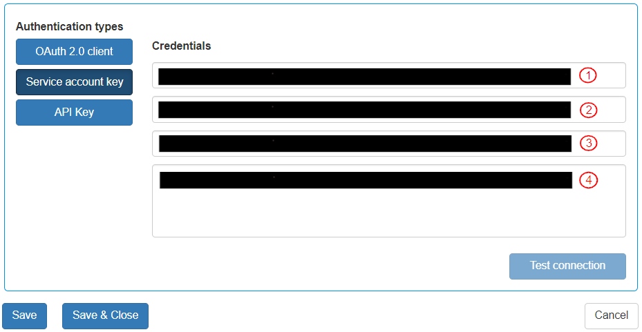 Enter the following credentials from the Json file downloaded from GCP during Google Account setup>Service Account Key credentials and click \[Save]:&#x20;