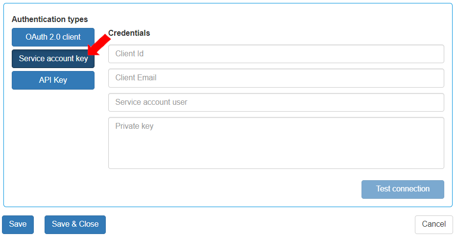 * Select Service account key. Enter the credentials generated in Google Account setup>.