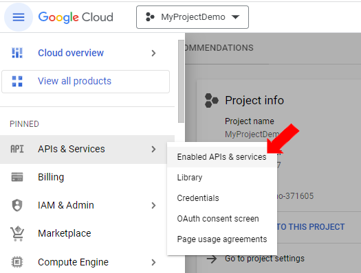 In the top-left corner, click on the Navigation Menu. In the “All Products” category, click APIs & Services>Enabled APIs & Services.