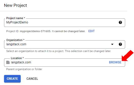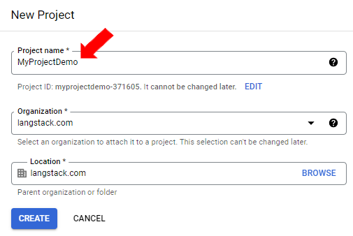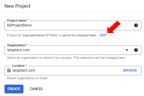 To edit the Project ID, click Edit (Optional). The project ID cannot be changed after the project is created.