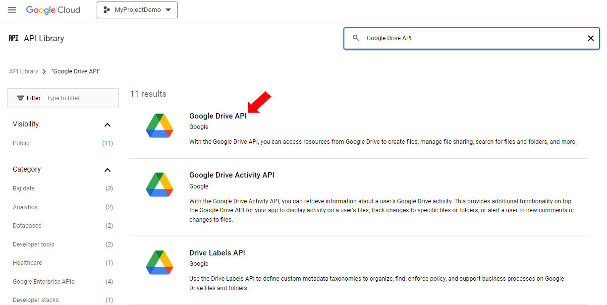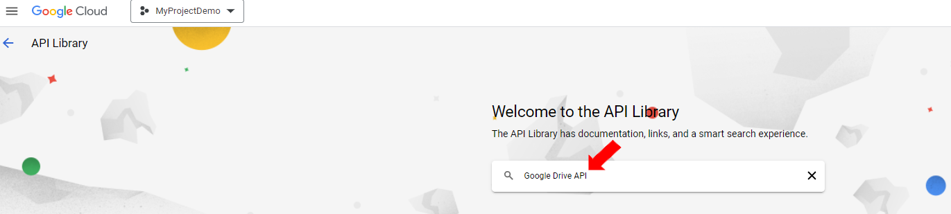 In the search field, enter the name of the API you want to enable. For example, type "Google Drive API" to find the Google Drive API.
